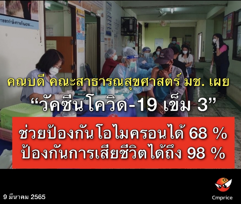 | • คณบดี คณะสาธารณสุขศาสตร์ มช. เผย วัคซีนโควิด-19 เข็ม 3 ช่วยป้องกันโอไมครอนได้ถึงร้อยละ 68 และป้องกันการเสียชีวิตได้ถึงร้อยละ 98 |