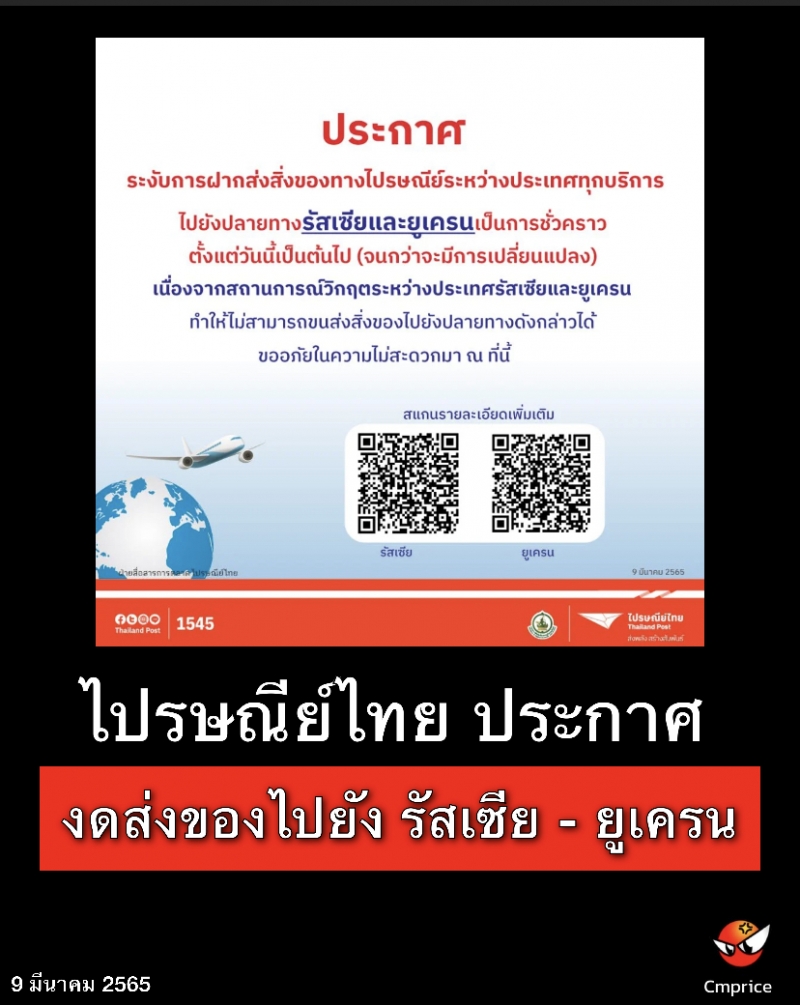เพจ ไปรษณีย์ไทย แจ้งข่าวเกี่ยวกับการรับ/ส่งพัสดุระหว่างประเทศ เนื่องจากสถานการณ์วิกฤตระหว่างประเทศรัสเซียและยูเครน ส่งผลให้ต้องระงับการฝากส่งสิ่งของทางไปรษณีย์ระหว่างประเทศทุกประเภทบริการไปยังปลายทางรัสเซียและยูเครน ตั้งแต่วันนี้ เป็นต้นไป (จนกว่าจะมีประกาศเปลี่ยนแปลง)