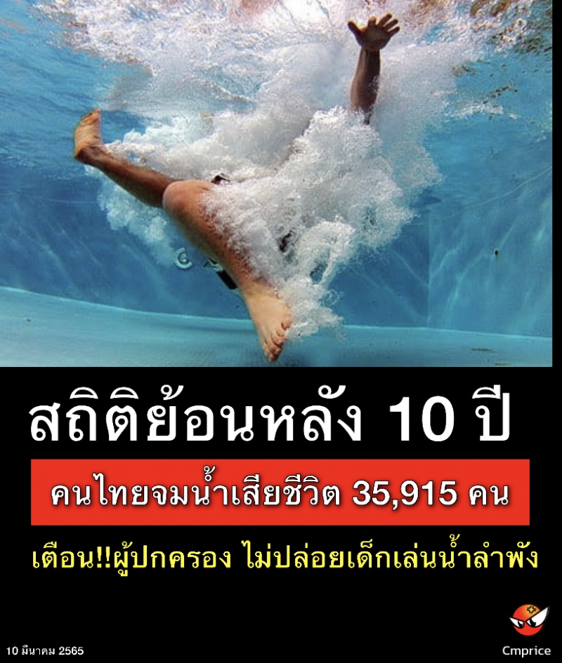 | • สถิติย้อนหลัง 10 ปี คนไทยจมน้ำเสียชีวิต 35,915 คน เตือนผู้ปกครอง ไม่ปล่อยเด็กเล่นน้ำลำพัง |
