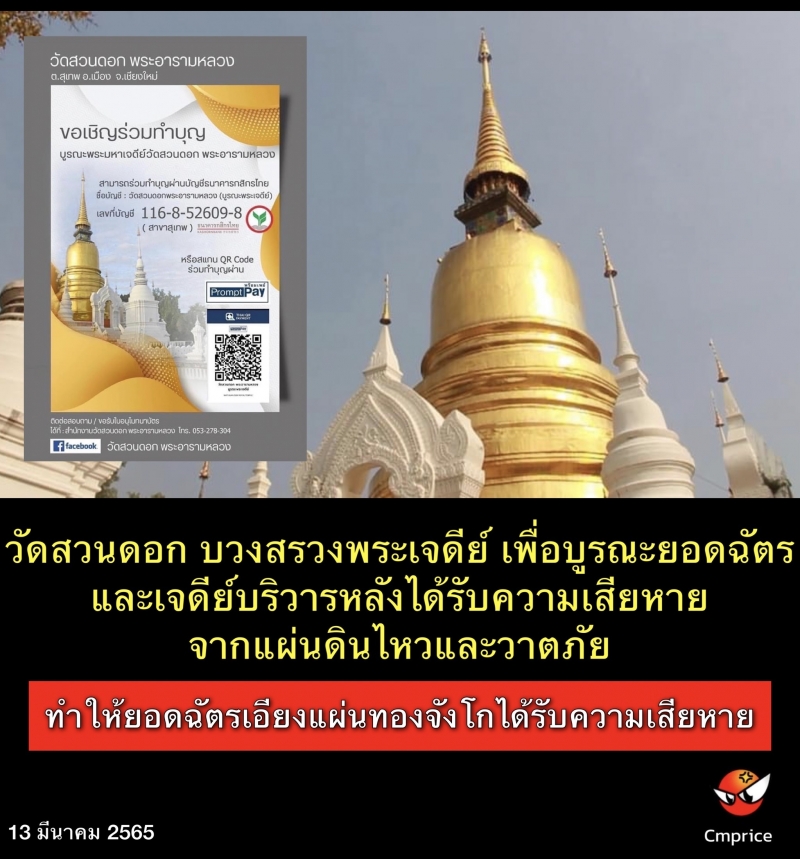 วัดสวนดอก พระอารามหลวง จังหวัดเชียงใหม่ ประกอบพิธีบวงสรวงพระเจดีย์ เพื่อบูรณะยอดฉัตรและเจดีย์บริวารโดยรอบ หลังได้รับความเสียหายจากเหตุแผ่นดินไหวและวาตภัย ทำให้ยอดฉัตรเอียงและแผ่นทองจังโกได้รับความเสียหาย