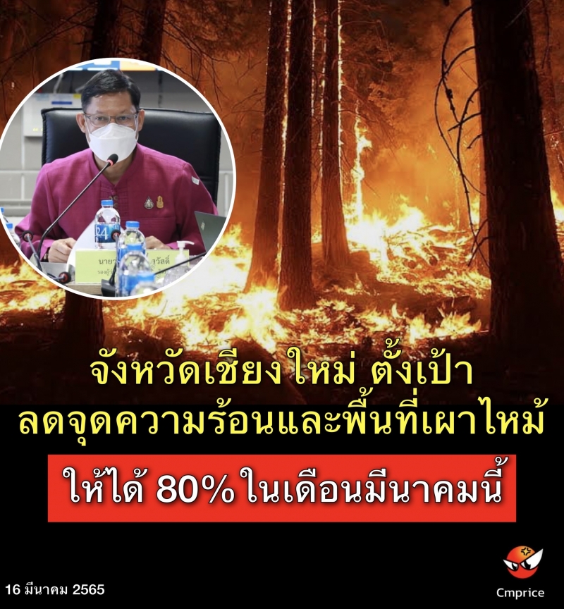 สำหรับสถานการณ์ไฟป่าและหมอกควันในพื้นที่จังหวัดเชียงใหม่ วันนี้ (15 มี.ค. 65) พบจุดความร้อน 21 จุด เกิดขึ้นในพื้นที่ป่า 18 จุด และพื้นที่เกษตรในป่า 3 จุด โดยตั้งแต่วันที่ 1 มกราคม 2565 จนถึงปัจจุบัน จังหวัดเชียงใหม่พบจุดความร้อนรวมทั้งหมดเพียง 1,551 จุด ลดลงจากค่าเฉลี่ย 3 ปีย้อนหลังถึงร้อยละ 77.90 ซึ่งเป็นผลมาจากการบริหารจัดการที่ดี รวมถึงความร่วมมือของทุกภาคส่วน