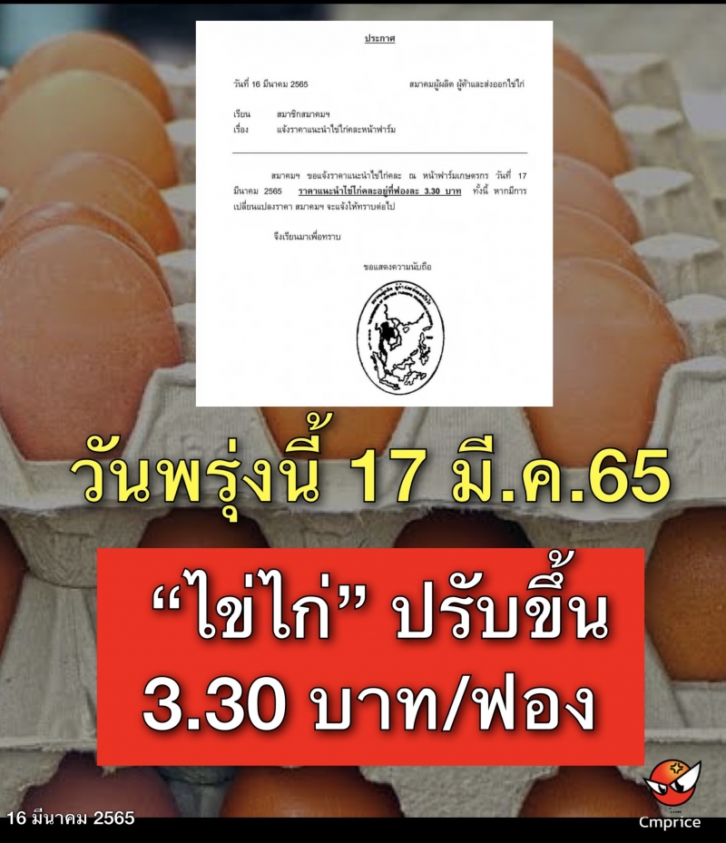 16 มีนาคม 2565 สมาคม ผู้ค้า และส่งออกไข่ไก่ ประกาศราคาแนะนำ ไข่ไก่คละ ณ หน้าฟาร์มเกษตรกร 3.30 บาท/ฟอง เริ่มมีผลตั้งแต่ 17 มี.ค.65