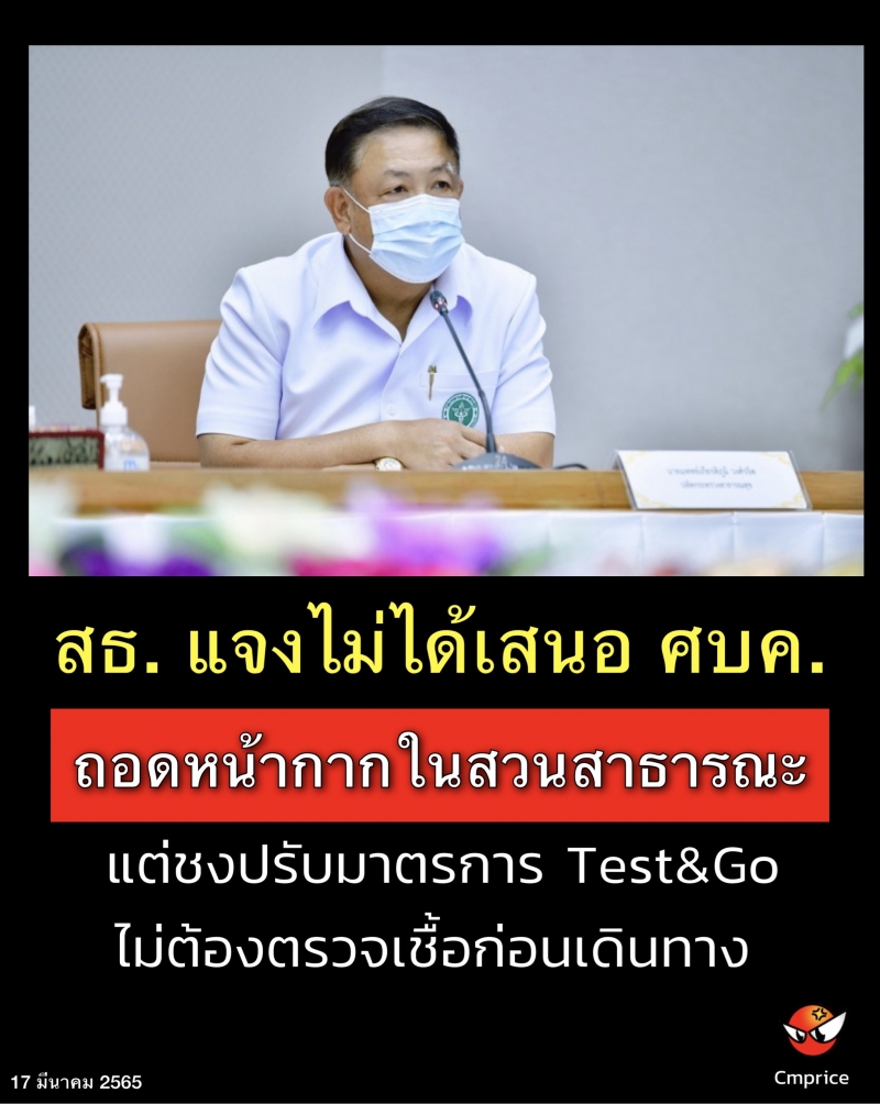 | • สธ. แจงไม่ได้เสนอ ศบค.ถอดหน้ากากในสวน แต่ชงปรับมาตรการ Test&Go ไม่ต้อง ตรวจเชื้อก่อนเดินทาง |
