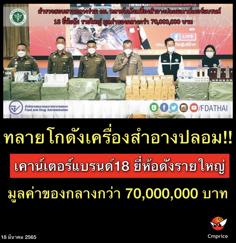วันที่ 18 มีนาคม 2565 กองบัญชาการตำรวจสอบสวนกลาง โดย พล.ต.ท.จิรภพ ภูริเดช ผบช.ก., เจ้าหน้าที่ตำรวจ ปคบ. โดยการสั่งการของ พล.ต.ต.ณัฐศักดิ์ เชาวนาศัย รอง ผบช.ก., พล.ต.ต.อนันต์ นานาสมบัติ ผบก.ปคบ., พ.ต.อ.ธรากร เลิศพรเจริญ รอง ผบก.ปอท. รรท.รอง ผบก.ปคบ., พ.ต.อ.เนติ วงษ์กุหลาบ ผกก.4 บก.ปคบ., สำนักงานคณะกรรมการอาหารและยา โดย นพ.ไพศาล ดั่นคุ้ม เลขาธิการคณะกรรมการอาหารและยา, นพ.วิทิต สฤษฎีชัยกุล รองเลขาธิการคณะกรรมการอาหารและยา ร่วมกันแถลงผลการปฏิบัติงานกรณีทลายแหล่งจำหน่ายเครื่องสำอางปลอมเคาน์เตอร์แบรนด์ดังหลายยี่ห้อ พบของกลางจำนวนมาก โดยลวงขายผ่านแพลตฟอร์มออนไลน์ ตรวจยึดผลิตภัณฑ์ที่ต้องสงสัยว่าปลอม 18 ยี่ห้อดัง มูลค่ากว่า 70,000,000 บาท