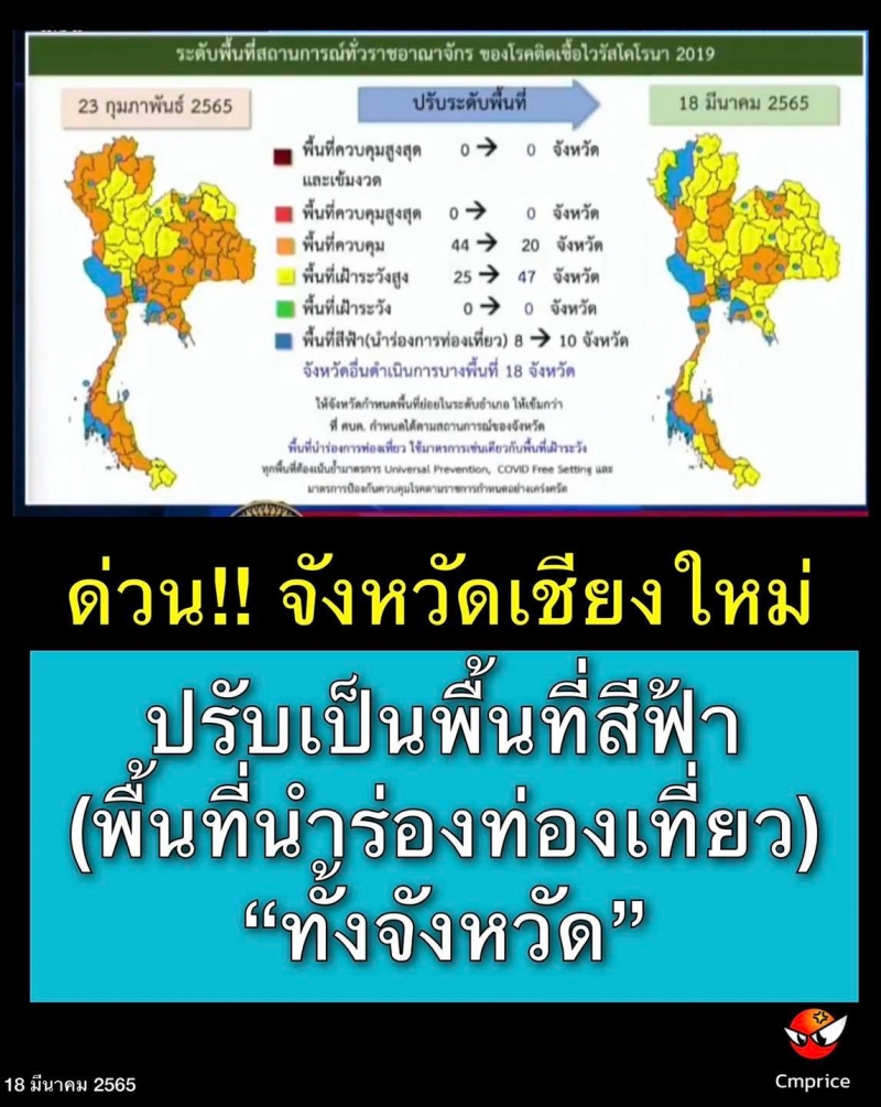 | • เชียงใหม่ เป็นพื้นที่สีฟ้า (พื้นที่นำร่องท่องเที่ยว) ทั้งจังหวัด ตั้งแต่วันนี้เป็นต้นไป |