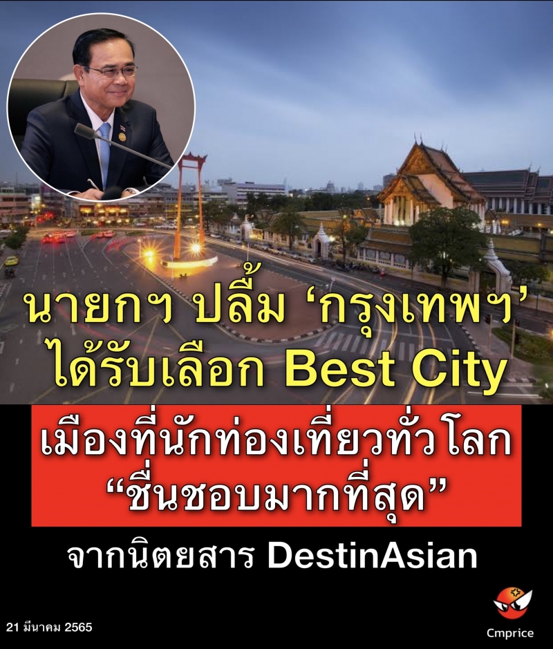 พล.อ.ประยุทธ์ จันทร์โอชา นายกฯ และ รมว.กลาโหม ยินดีที่ทราบว่า นิตยสาร DestinAsian จัดให้ ‘กรุงเทพฯ’ เป็นอันดับ 1 ในเมืองที่นักท่องเที่ยวทั่วโลกชื่นชอบมากที่สุด (Best City) ในการท่องเที่ยวเอเชียแปซิฟิค จากผลการคัดเลือกของผู้อ่าน (Reader's Choice Awards 2022) ซึ่ง 5 อันดับแรกได้แก่ กรุงเทพฯ สิงคโปร์ โตเกียว ฮ่องกง และโซล ตามลำดับ โดยกรุงเทพฯ เคยได้รับเลือกอันดับที่ 1 มาแล้วเมื่อปี 2020