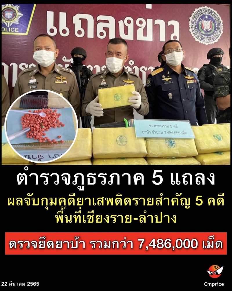 ตำรวจภูธรภาค 5 ขอแถลงผลการจับกุมคดียาเสพติดรายสำคัญ (ระหว่างวันที่ 15-17 มี.ค.65) จำนวน 5 คดี พื้นที่จังหวัดเชียงรายและจังหวัดลำปาง สามารถจับกุม/ตรวจยึด ยาบ้า รวมกว่า 7,486,000 เม็ด จับผู้ต้องหารวม 10 คนอันเป็นผลสืบเนื่องจากการประสานความร่วมมือและการบูรณาการของหน่วยงานด้านการปราบปรามยาเสพติดต่างๆเช่น ตำรวจภูธรภาค 5 ,ศูนย์ปฏิบัติการบริหารการแก้ไขปัญหายาเสพติดชายแดนภาคเหนือ(ศป.ปส.ชน.),กองกำลังผาเมือง,ฝ่ายปกครองจังหวัดเชียงราย, บช.ปส.,ตำรวจภูธรจังหวัดเชียงราย,ตำรวจภูธรจังหวัดลำปาง ซึ่งได้นำนโยบายด้านการปราบปรามยาเสพติดของรัฐบาล พล.อ.ประยุทธ จันทร์โอชา นายกรัฐมนตรี , พล.ต.อ.สุวัฒน์ แจ้งยอดสุข ผบ.ตร. , พล.ต.อ.รอย อิงคไพโรจน์ รอง ผบ.ตร. มาปฏิบัติจนเกิดผลเป็นรูปธรรม ดังนี้