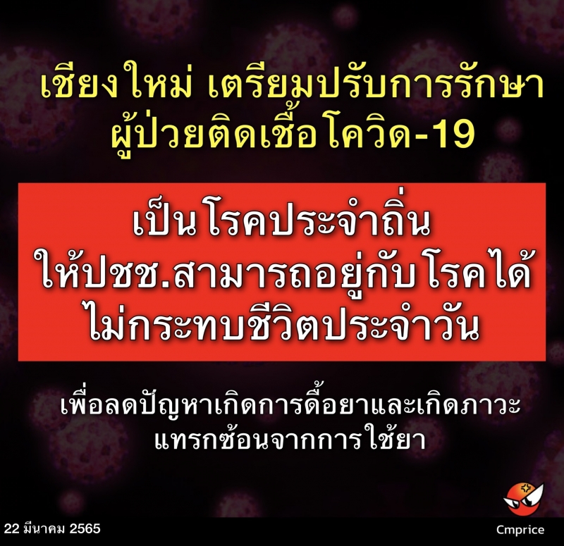 วันนี้ ( 22 มี.ค. 65 ) ที่ห้องประชุม 4 ชั้น 4 อาคารอำนวยการ ศาลากลางจังหวัดเชียงใหม่ นายแพทย์กิตติพันธุ์ ฉลอมผู้ช่วยนายแพทย์สาธารณสุขจังหวัดเชียงใหม่ เปิดเผยในการแถลงข่าวสื่อมวลชนประจำสัปดาห์  เกี่ยวกับการเตรียมความพร้อมในการรักษาผู้ป่วยโควิด-19  แบบโรคประจำถิ่น (Endemic) เพื่อให้ประชาชนสามารถอยู่กับโรคนี้ได้โดยไม่กระทบกับการดำเนินชีวิตประจำวัน