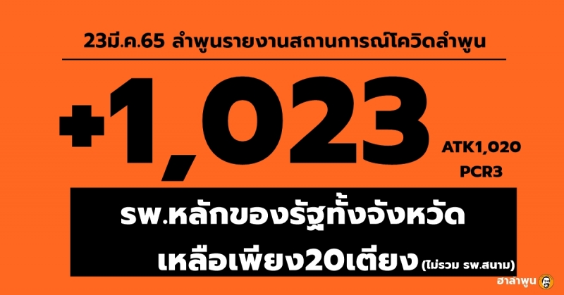 | • ลำพูนติดเชื้อเพิ่ม1,023ราย รพ.หลักของรัฐ เหลือเพียง20เตียง(ไม่รวม รพ.สนาม) 23มี.ค.65 |