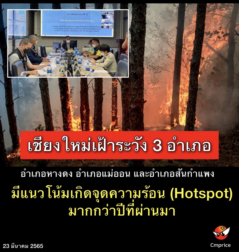 | • เชียงใหม่เฝ้าระวัง 3 อำเภอ มีแนวโน้มเกิดจุดความร้อน (Hotspot) มากกว่าปีที่ผ่านมา |