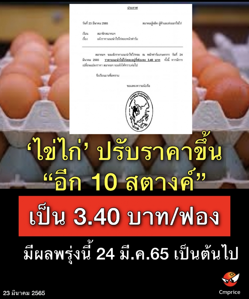 | • ไข่ไก่ ปรับราคาขึ้นอีก 10 สตางค์ เป็น 3.40 บาท/ฟอง มีผลพรุ่งนี้ 24 มี.ค.65 เป็นต้นไป |