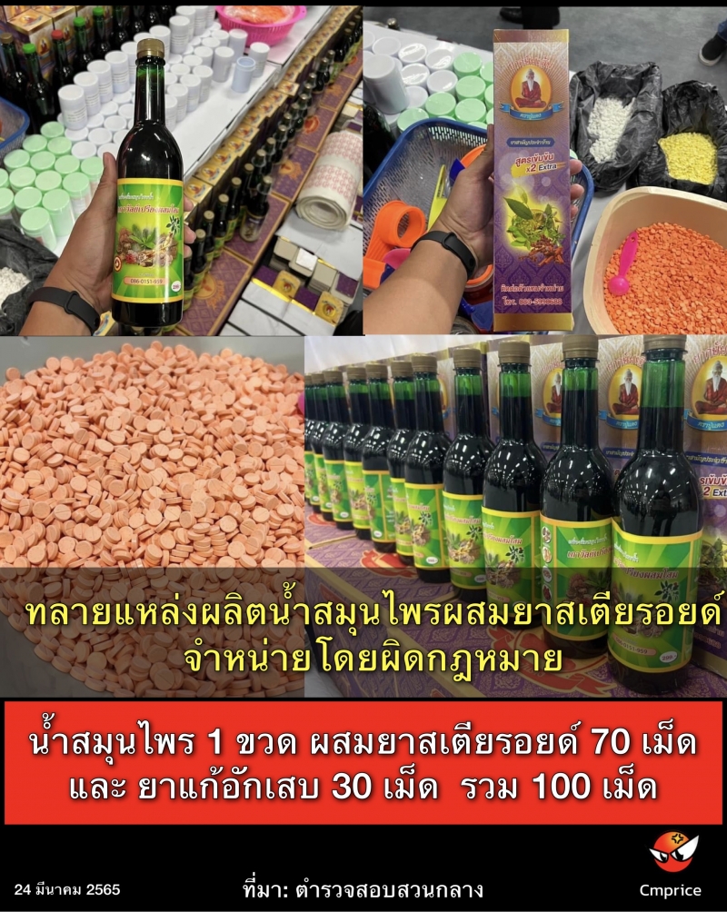 ทลายแหล่งผลิตน้ำสมุนไพรผสมยาสเตียรอยด์ จำหน่ายโดยผิดกฎหมายน้ำสมุนไพร 1 ขวด จะผสมยาสเตียรอยด์ 70 เม็ด และ ยาแก้อักเสบ 30 เม็ด รวม 100 เม็ด