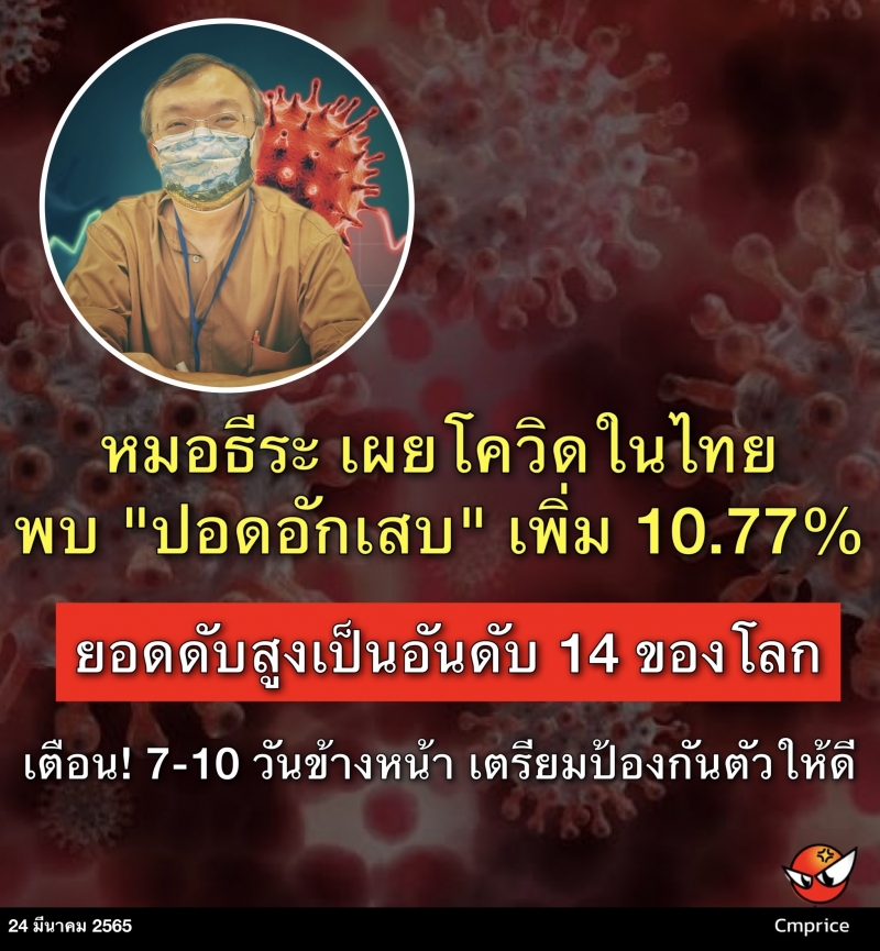 24 มีนาคม 2565 รศ.นพ.ธีระ วรธนารัตน์ คณะแพทยศาสตร์ จุฬาลงกรณ์มหาวิทยาลัย ออกมาให้ข้อมูลผ่านเฟซบุ๊กส่วนตัว ให้ความรู้หลายโพสต์ระบุ ยอดผู้ติดเชื้อประเทศไทย 27,024 ราย  ATK 26,768ราย รวม 53,792 ราย  หนึ่งสัปดาห์ผ่านไป ปอดอักเสบเพิ่มขึ้นจาก 1402 คน เป็น 1,553 คน เพิ่มขึ้น 10.77%  ใส่ท่อช่วยหายใจเพิ่มจาก 504 คนเป็น 583 คน เพิ่มขึ้น 15.67%   จำนวนติดเชื้อรวม ATK ของวันนี้ เพิ่มขึ้นกว่าสัปดาห์ก่อน 15.18% แต่ลดลงกว่าสองสัปดาห์ก่อน 25.78%