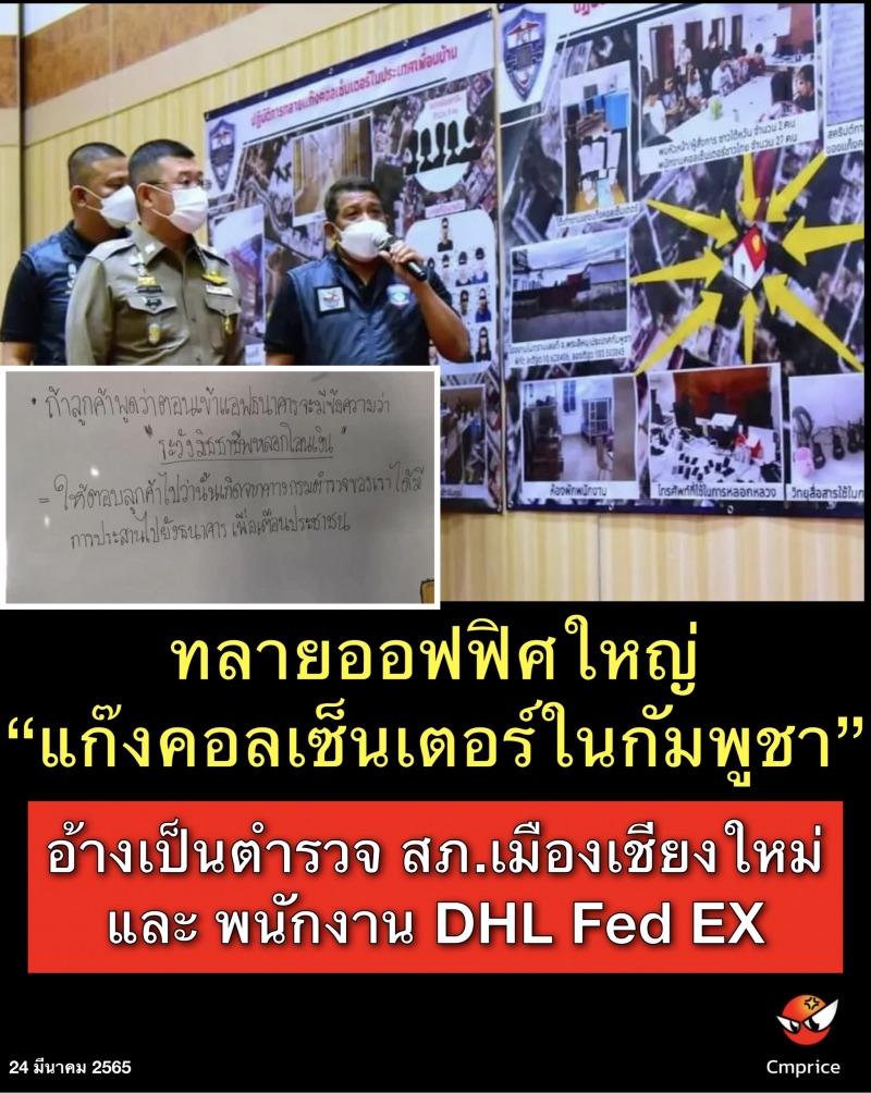 ทลายออฟฟิศใหญ่แก๊งคอลเซ็นเตอร์ในกัมพูชา อ้างเป็นตำรวจ สภ.เมืองเชียงใหม่ และ พนักงาน DHL Fed EX ผู้เสียหายจำนวนมาก