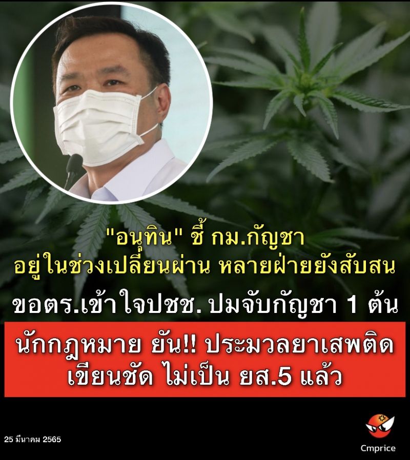 | • "อนุทิน" ชี้ กม.กัญชา อยู่ในช่วงเปลี่ยนผ่าน หลายฝ่ายยังสับสน ขอ ตำรวจเข้าใจประชาชน |