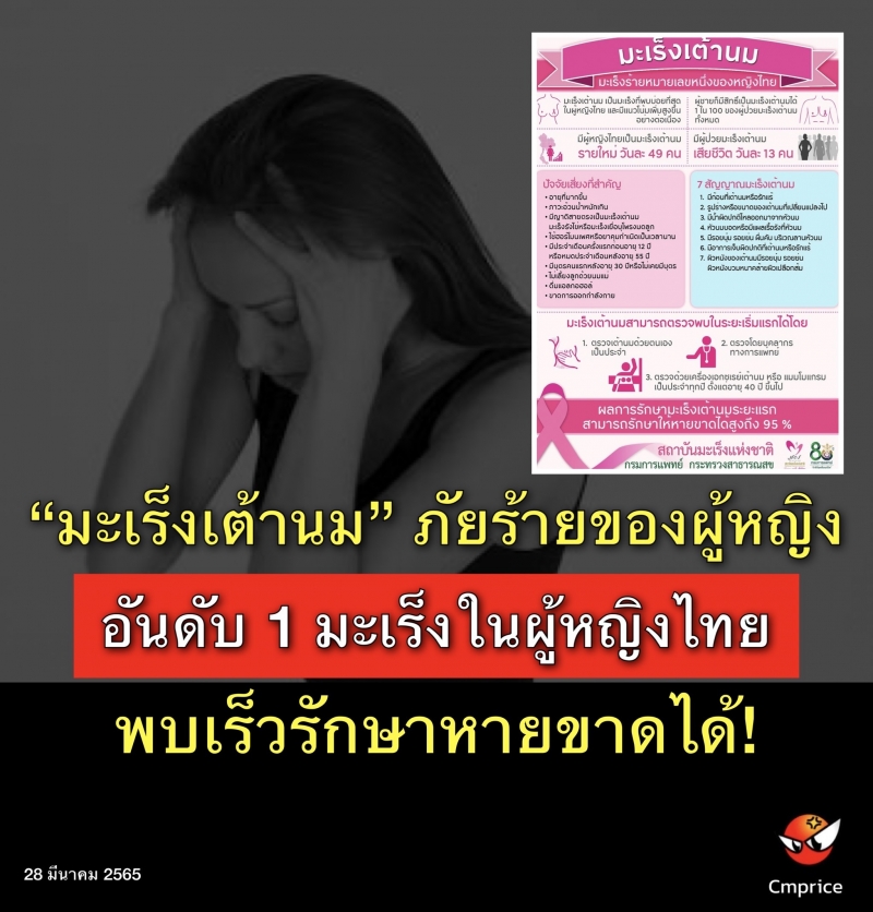 กรมการแพทย์ โดยสถาบันมะเร็งแห่งชาติ ชี้มะเร็งเต้านมภัยร้ายของผู้หญิง พบบ่อยที่สุดในผู้หญิงทั่วโลก และพบมากเป็นอันดับ 1 ของมะเร็งในผู้หญิงไทย แนะหมั่นตรวจเต้านมด้วยตนเองทุกเดือน และสังเกตความผิดปกติเช่นขนาดหรือรูปร่างของเต้านมที่เปลี่ยนแปลงไปจากเดิม เป็นแผลและอาจมีน้ำเหลืองหรือของเหลวสีคล้ายเลือดไหลออกมาหรือเป็นผื่นบริเวณหัวนม ชี้หากพบแพทย์ในระยะแรกสามารถรักษาหายขาดได้