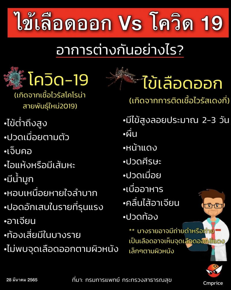 นายแพทย์อดิศัย ภัตตาตั้ง ผู้อำนวยการสถาบันสุขภาพเด็กแห่งชาติมหาราชินี กรมการแพทย์ กล่าวเพิ่มเติมว่าสาเหตุของโรคไข้เลือดออก เกิดจากการติดเชื้อไวรัสเดงกี่ มี 4 สายพันธุ์ คือ DENV-1, DENV-2, DENV-3 และDENV-4 โดยมียุงลายเป็นพาหะนำโรค ส่วนโรค โควิด 19 เกิดจากเชื้อไวรัสโคโรน่าสายพันธุ์ใหม่2019 (SARS-CoV-2) สามารถแพร่จากคนสู่คนได้ทางละอองฝอย เสมหะน้ำลาย ผ่านการสัมผัสเยื่อบุตา จมูก ปาก แต่ในกรณีถ้าเกิดการระบาดพร้อมๆ กัน ก็จะมีโอกาสพบผู้ป่วยที่ติดเชื้อโควิด 19 และเป็นไข้เลือดออกได้ ผู้ป่วยไข้เลือดออกในระยะวิกฤต จะมีน้ำเหลืองรั่วออกนอกเส้นเลือด ทำให้เกิดภาวะช็อก ซึ่งถ้าไม่ได้รับสารน้ำทดแทนอย่างทันท่วงที จะทำให้เกิดภาวะช็อกนาน จนเกิดตับวาย ไตวาย และอวัยวะอื่นๆ ทำงานล้มเหลว จนเสียชีวิตได้ สำหรับโควิด 19 “โอไมครอน” ในผู้ป่วยบางรายอาจมีอาการคล้ายกับโรคไข้เลือดออก โดยเฉพาะอาจมีไข้สูง อาเจียน หรือท้องเสียได้ประวัติการสัมผัสใกล้ชิดผู้ป่วยโควิดในระยะ 7 - 10 วัน และการทำ ATK ด้วยตนเอง จะช่วยคัดกรองแยกโรคได้ ในกรณีที่แยกไม่ได้ การตรวจเลือด เช่น การหาค่าความสมบูรณ์ของเม็ดเลือด (complete blood count) และการตรวจหาโปรตีนเอ็น เอส-หนึ่ง ของไวรัสไข้เลือดออก โดยเฉพาะในช่วง 3 วันแรกของไข้