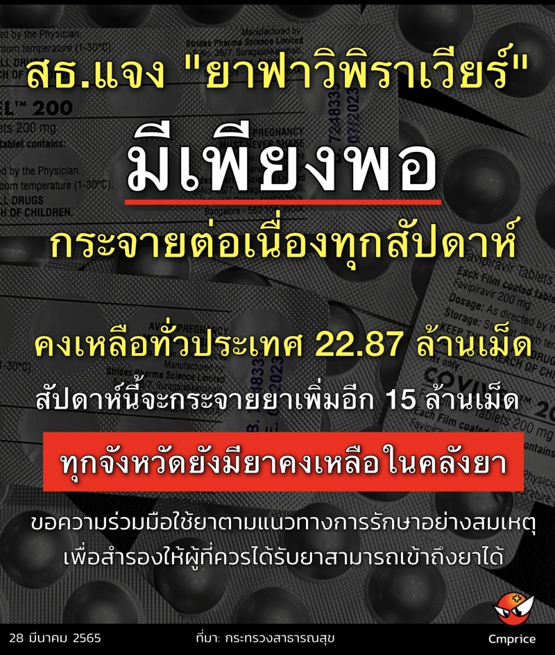 วันนี้ (28 มีนาคม 2565) นพ.ธงชัย กีรติหัตถยากร รองปลัดกระทรวงสาธารณสุข กล่าวถึงกรณีมีข่าวยาฟาวิพิราเวียร์ที่ใช้รักษาผู้ป่วยโควิด 19 ไม่เพียงพอ ว่า ยืนยันขณะนี้ประเทศไทยยังมียาฟาวิพิราเวียร์เพียงพอในการดูแลผู้ป่วยโควิด 19 โดยมอบให้องค์การเภสัชกรรมเป็นผู้จัดหา ตั้งแต่ช่วงเดือนกุมภาพันธ์-เมษายน 2565 องค์การเภสัชกรรมได้ผลิตและจัดหายาฟาวิพิราเวียร์เข้ามารวม 128.1 ล้านเม็ด เฉพาะช่วงวันที่ 1-28 มีนาคม 2565 มีการผลิตและจัดหายาแล้ว 73.9 ล้านเม็ด ส่งกระจายยาให้ทุกจังหวัดทั่วประเทศ 72.52 ล้านเม็ด ข้อมูลถึงวันที่ 28 มีนาคม2565 คงเหลือยาทั่วประเทศ 22.87 ล้านเม็ด โดยพื้นที่ กทม.มียาคงเหลือมากที่สุด 5.12 ล้านเม็ด รองรับผู้ป่วยได้1.02 แสนราย ขณะที่จังหวัดอื่นๆ มียาคงเหลือเพียงพอรองรับผู้ป่วยเช่นกัน ทั้งนี้ ส่วนกลางมีการจัดหายา และกระจายยาให้แก่ทุกจังหวัดอย่างต่อเนื่องทุกสัปดาห์ โดยช่วงวันที่ 29 มีนาคม - 2 เมษายน 2565 จะมียาอีก 15 ล้านเม็ด วันที่3-9 เมษายน 2565 อีก 11.6 ล้านเม็ด และวันที่ 10-16 เมษายน 2565 จำนวน 20 ล้านเม็ด