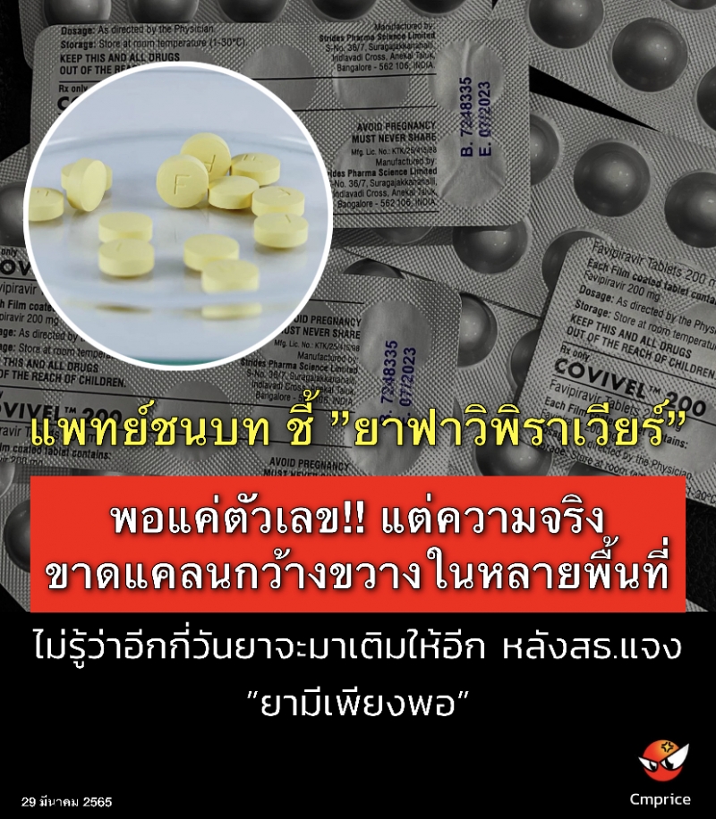 เมื่อแพทย์ชนบทสะท้อนเสียงภาวะการขาดแคลนฟาวิพิราเวียร์ เมื่อวันจันทร์ที่ 28 มีนาคม 2565 (เมื่อวาน) ซึ่งเป็นเสียงสะท้อนจากผู้ปฏิบัติงานโรงพยาบาลต่างๆทั่วประเทศ และเมื่อสิ่งที่สะท้อนเป็นความจริง จึงมีการแชร์และการคอมเม้นท์ทั้งในเพจชมรมแพทย์ชนบทและเพจอื่นๆอย่างหนาแน่น เสียงสะท้อนของประชาชนนั้นยิ่งชัดเจนว่า ที่ผ่านมาในเดือนมีนาคม โรงพยาบาลต่างๆมียาฟาวิที่จำกัดและไม่เพียงพอจริง