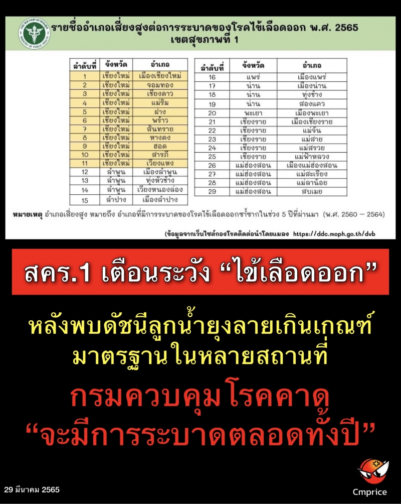 สำนักงานป้องกันควบคุมโรคที่ 1 เชียงใหม่ เตือนประชาชนระวัง “ไข้เลือดออก” หลังพบดัชนีลูกน้ำยุงลายเกินเกณฑ์มาตรฐานในหลายสถานที่ ด้านกรมควบคุมโรคคาดจะมีการระบาดตลอดทั้งปี แนะใช้มาตรการ “3 เก็บ ป้องกัน 3 โรค