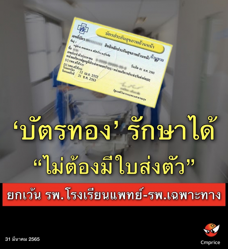 | • บัตรทอง รักษาโดยไม่ต้องมีใบส่งตัว ยกเว้น รพ.โรงเรียนแพทย์-รพ.เฉพาะทาง |