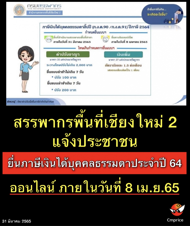 สรรพากรพื้นที่เชียงใหม่2 แจ้งประชาชนยื่นภาษีเงินได้บุคคลธรรมดา ประจำปี 2564 ออนไลน์ ภายในวันที่ 8 เมษายน 2565