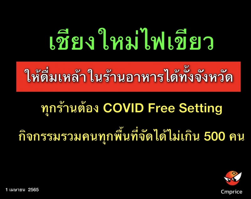 | • รับลูก ศบค. เชียงใหม่ไฟเขียวให้ดื่มเครื่องดื่มแอลกอฮอล์ในร้านอาหารได้ทั้งจังหวัด |