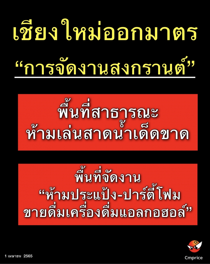 ทั้งนี้คำสั่งฯ นี้ สั่งห้ามเล่นสาดน้ำ ประแป้ง และปาร์ตี้โฟม โดยเด็ดขาด ในพื้นที่สาธารณะที่ไม่มีการควบคุมกำกับและไม่ได้รับอนุญาตให้จัดงาน