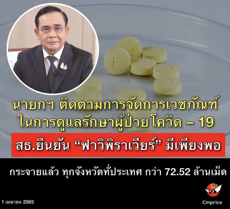 นายกฯ ติดตามการจัดการเวชภัณฑ์ในการดูแลรักษาผู้ป่วยโควิด – 19 ยืนยัน “ฟาวิพิราเวียร์” มีเพียงพอ กระจายยาไปแล้ว ทุกจังหวัดทั่วประเทศ กว่า 72.52 ล้านเม็ด