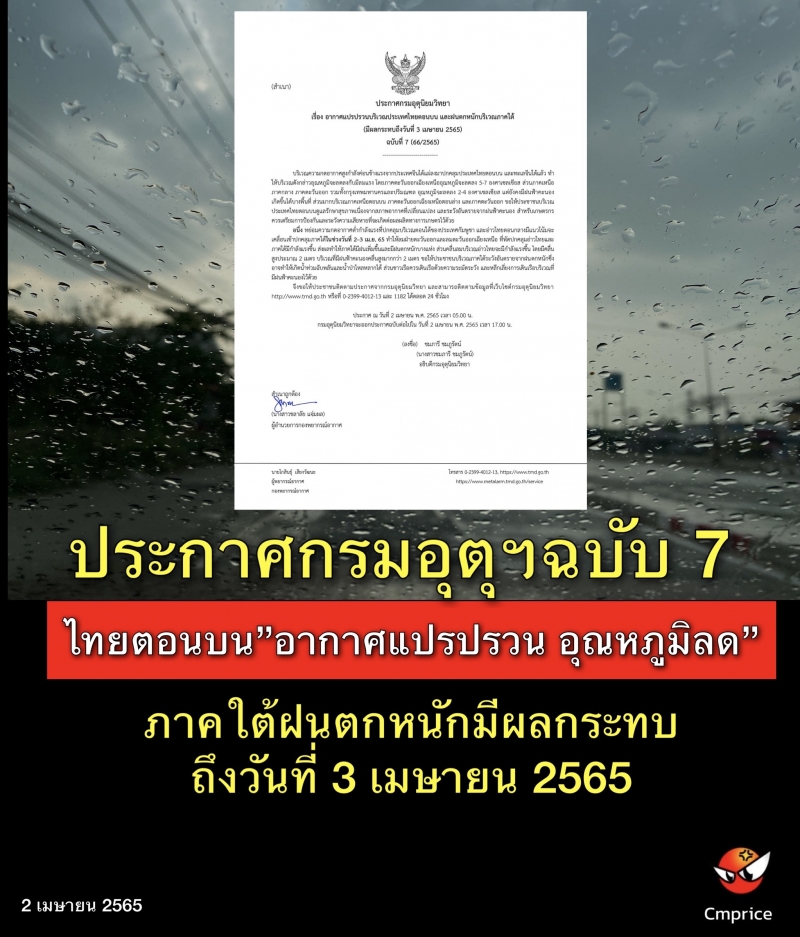 | • ประกาศกรมอุตุฯฉบับ 7 ไทยตอนบนอากาศแปรปรวน อุณหภูมิลด ภาคใต้ฝนตกหนักมีผลกระทบถึงวันที่ 3 เมษายน 2565 |