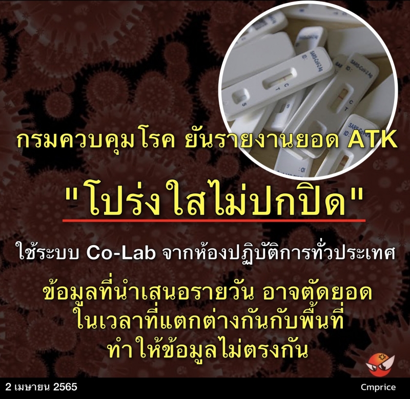 นายแพทย์จักรรัฐ พิทยาวงศ์อานนท์ ผู้อำนวยการกองระบาดวิทยา แถลงกรณีข้อสงสัยการคุมตัวเลขผู้ติดเชื้อโควิดจากการตรวจ ATK เนื่องจากยอดในระบบ Dashboard และตัวเลขรายงานจังหวัดไม่ตรงกัน นั้น กรมควบควบคุมโรคขอชี้แจงว่า การดำเนินงานด้านข้อมูลเกี่ยวกับโรคติดเชื้อไวรัสโคโรนา 2019 มีความโปร่งใสตามมาตรฐานวิชาชีพไม่มีการปกปิดข้อมูลแต่อย่างใด แต่เนื่องจากการรายงานยอดผู้ติดเชื้อโควิด 19 อัพเดทรายวัน ที่ปรากฏบนระบบDashboard ในเว็บไชต์กรมควบคุมโรค โดยข้อมูลการตรวจ ATK เป็นการใช้ข้อมูลจากระบบ Co-Lab ซึ่งเป็นข้อมูลที่มาจากห้องปฏิบัติการทั่วประเทศของกรมวิทยาศาสตร์การแพทย์ ซึ่งข้อมูลที่นำเสนอรายวันจากกรมควบคุมโรคอาจมีการตัดยอดในเวลาที่แตกต่างกันกับพื้นที่ จึงทำให้ได้ข้อมูลไม่ตรงกัน