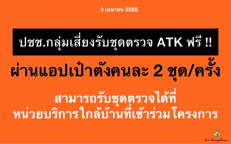 ประชาชนไทยทุกสิทธิการรักษาที่เป็นกลุ่มเสี่ยงสามารถขอรับชุดตรวจ ATK ได้ฟรีผ่านแอปเป๋าตัง และเลือกหน่วยบริการใกล้ฉันเพื่อไปรับชุดตรวจ กรณีไม่มีมือถือสมาร์โฟน ทางเจ้าหน้าที่จะดำเนินการตรวจคัดกรองให้ก่อนรับชุดตรวจ ATK ฟรี ให้นำบัตรประชาชนไปด้วย โดยสมารถตรวจสอบรายชื่อหน่วยบริการที่เข้าร่วมแจกชุดตรวจ ATK ได้ที่เว็บไซต์ สปสช. https://www.nhso.go.th/page/atk
