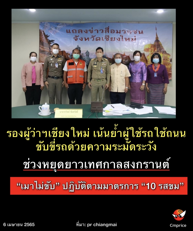 รองผู้ว่าราชการจังหวัดเชียงใหม่ เน้นย้ำผู้ใช้รถใช้ถนน ขับขี่รถด้วยความระมัดระวังช่วงหยุดยาวเทศกาลสงกรานต์“เมาไม่ขับ” และปฏิบัติตามมาตรการ “10 รสขม”