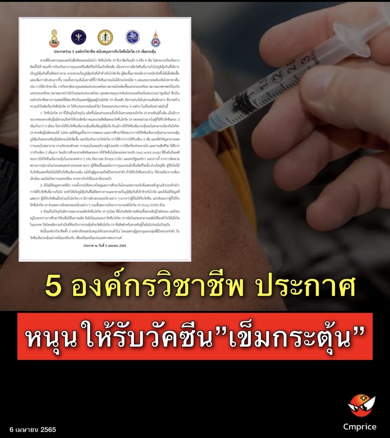 ดังนั้นองค์กรวิชาชีพทั้ง 5 องค์กรจึงขอสนับสนุนให้ประชาชนทั่วไป โดยเฉพาะวัคซีนเข็มกระตุ้นอย่างพร้อมเพรียงกัน เพื่อเตรียมพร้อมก่อนเทศกาลสงกรานต์