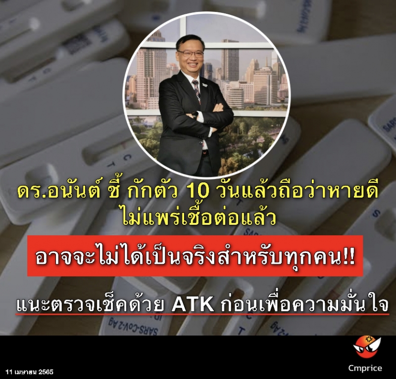 | • ดร.อนันต์ ชี้กักตัว 10 วันแล้วถือว่าหายดี ไม่แพร่เชื้อต่อแล้ว อาจจะไม่ได้เป็นจริงสำหรับทุกคน!! แนะตรวจเช็คด้วย ATK ก่อนเพื่อความมั่นใจ |