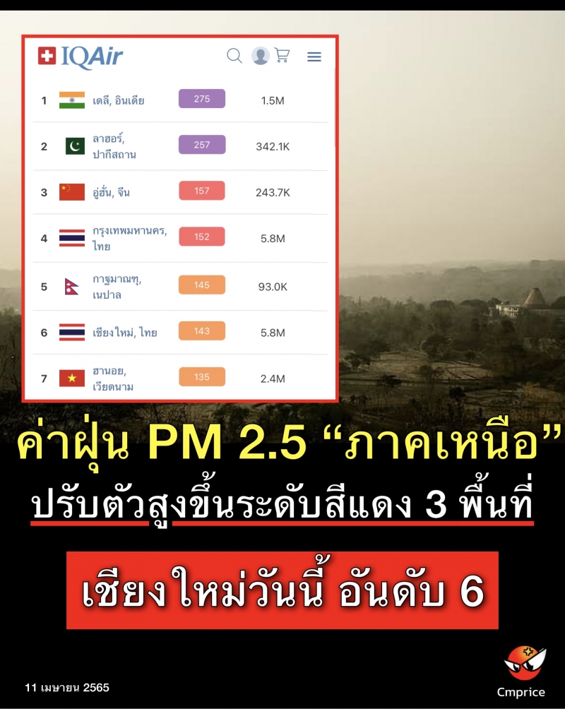 นายอรรถพล เจริญชันษา อธิบดีกรมควบคุมมลพิษ ในฐานะประธานศูนย์แก้ไขปัญหามลพิษทางอากาศ กล่าวว่า วันนี้(11 เม.ย.65) ค่าฝุ่นละอองขนาดไม่เกิน 2.5 ไมครอน (PM 2.5) ในพื้นที่ 17 จังหวัดภาคเหนือมีคุณภาพอากาศปานกลางถึงมีผลกระทบต่อสุขภาพ พบค่าฝุ่นสูงระดับสีแดง 3 พื้นที่ คือ ต.ท่าอิฐ อ.เมือง จ.อุตรดิตถ์ , ต.ในเมือง อ.เมืองจ.พิษณุโลก และ ต.ท่าหลวง อ.เมือง จ.พิจิตร โดยบางพื้นที่พบสูงเกิน 100 ไมโครกรัมต่อลูกบาศก์เมตร แล้วต้องเฝ้าระวังช่วงวันที่ 17 - 18 เมษายน หากจุดความร้อนมีจำนวนมากขึ้นอาจส่งผลให้ฝุ่นละอองสูงขึ้นได้ โดยเฉพาะภาคเหนือฝั่งตะวันออกและภาคตะวันออกเฉียงเหนือ