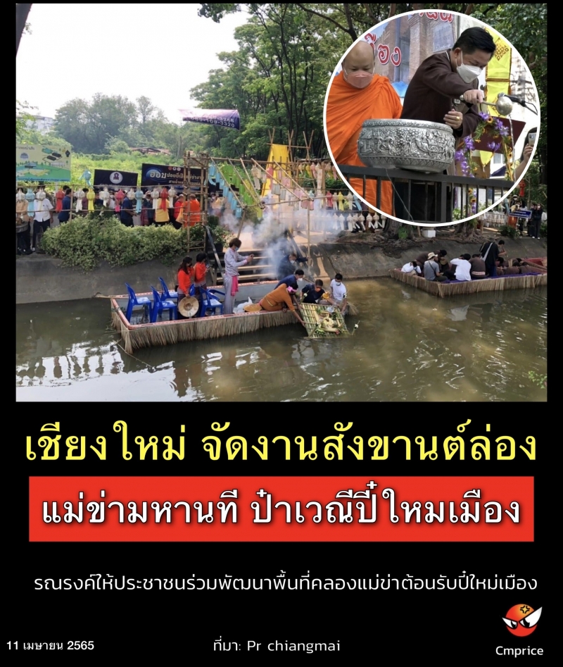 วันนี้ (11 เม.ย. 65) นายประจญ ปรัชญ์สกุล ผู้ว่าราชการจังหวัดเชียงใหม่ เป็นประธานเปิดงาน “สังขานต์ล่อง แม่ข่ามหานที ป๋าเวณีปี๋ใหม่เมือง” ซึ่งจัดขึ้นที่บริเวณท่าน้ำแม่ข่าชัยศรีภูมิ ถนนอัษฎาธร อำเภอเมืองเชียงใหม่ จังหวัดเชียงใหม่ เพื่อสืบสานวัฒนธรรมประเพณีของชาวล้านนา ที่ยึดถือปฏิบัติกันมาในช่วงสงกรานต์ หรือ ปี๋ใหม่เมือง พร้อมทั้งรณรงค์ให้ประชาชนที่อาศัยอยู่ในลุ่มน้ำแม่ข่ามีความเข้าใจในคุณค่าและความหมายของประเพณีวัฒนธรรมที่ดีงาม มาช่วยกันปฏิบัติเพื่อขจัด ละเลิก สิ่งไม่ดีงามต่างๆ ที่เคยได้กระทำกับแม่น้ำข่า รวมทั้งการปฏิบัติต่อแหล่งน้ำแม่น้ำและลำน้ำสาขาทุกสายด้วย นอกจากนี้ยังเป็นการสร้างความเป็นสิริมงคล และฟื้นฟูน้ำแม่ข่า ให้กลับมาเป็นสายน้ำแห่งชัยมงคลของเมืองเชียงใหม่