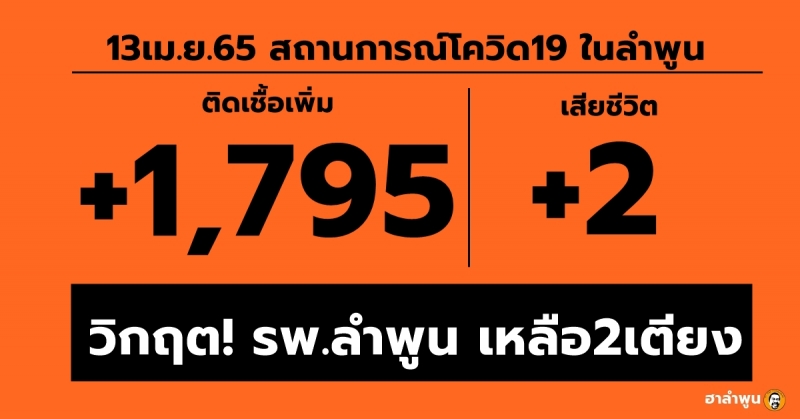 | • ลำพูนติดเชื้อเพิ่ม1,795ราย ดับ2 อาการหนัก19 ,รพ.ลำพูนวิกฤตเตียงใกล้เต็ม (13เมษา65) |