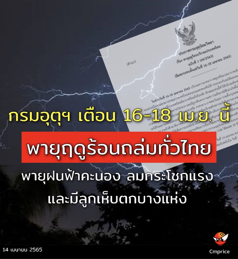 กรมอุตุนิยมวิทยา ประกาศเตือน ฉบับที่ 1 "พายุฤดูร้อนบริเวณประเทศไทย" กระทบทั่วทุกภาค เฝ้าระวังฝนถล่ม ลมกระโชกแรง ลูกเห็บตก ฟ้าผ่า ช่วงหลังสงกรานต์ 2565 วันนี้สภาพอากาศ ไทยตอนบนอากาศร้อนจัด อุณหภูมิสูงสุด41 องศาเซลเซียส