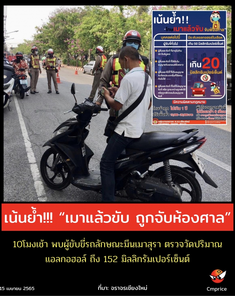 พ.ต.อ.เจน โสภา ผกก.กลุ่มงานจราจรฯ มอบหมายให้พ.ต.ท.มารุตน์ ดาวนันท์ รองผกกฯและพ.ต.ท.สุรจิตร ศรีพรรณสว.ฯ ออกตรวจ การปฏิบัติของจุดตรวจบูรณาการ จุดตรวจกวดขันวินัยจราจร แจ่งศรีภูมิ และมีการตั้งจุดตรวจแอลกอฮอล์ ในห้วงเทศกาลปีใหม่ พ.ศ.2565 ในเขตพื้นที่ กลุ่มงานจราจรฯ ณ จุดตรวจบูรณาการในตัวเมืองเชียงใหม่ พบผู้ขับขี่รถจักรยานยนต์ลักษณะมึนเมาสุรา จึงได้เรียกตรวจวัดปริมาณแอลกอฮอล์ ถึง152 มิลลิกรัมเปอร์เซ็นต์ซึ่งมีค่าเกินกว่ากฎหมายกำหนดไว้จึงได้บันทึกจับกุมส่งพนักงานสอบสวนเพื่อส่งฟ้องศาลต่อไป เป็นมาตรการสำคัญในการป้องกันการเกิดอุบัติเหตุและลดความสูญเสียที่จะเกิดจากการเมาแล้วขับ จับจริง