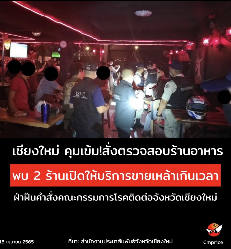| • ผู้ว่าฯ เชียงใหม่ คุมเข้มสั่งตรวจสอบร้านอาหาร พบ 2 ร้านเปิดให้บริการขายเหล้าเกินเวลา ฝ่าฝืนคำสั่ง |