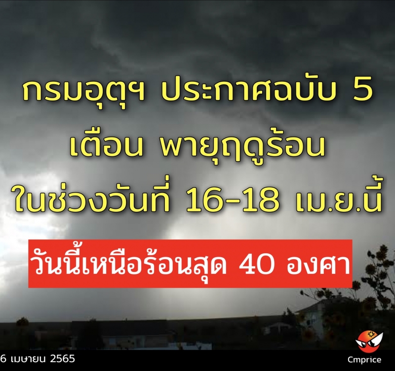 17 - 19 เม.ย. 65 บริเวณความกดอากาศสูงหรือมวลอากาศเย็นกำลังปานกลางจากประเทศจีนจะผ่ลงมาปกคลุมประเทศไทยตอนบนและทะเลจีนใต้ ประกอบกับมีลมใต้และลมตะวันออกเฉียงใต้พัดนำความชื้นจากอ่าวไทยเข้ามาปกคลุมประเทศไทยตอนบน ในขณะที่บริเวณประเทศไทยตอนบนมีอากาศร้อนถึงร้อนจัด ทำให้บริเวณดังกล่าวจะมีพายุฤดูร้อนเกิดขึ้น โดยมีลักษณะของพายุฝนฟ้าคะนอง ลมกระโชกแรง และลูกเห็บตกบางแห่ง รวมถึงอาจมีฟ้าผ่าเกิดขึ้นได้บางพื้นที่ โดยจะเริ่มในภาคตะวันออกเฉียงเหนือก่อน ส่วนภาคอื่นๆจะได้รับผลกระทบในระยะถัดไป ขอให้ประชาชนที่อาศัยอยู่ในบริเวณประเทศไทยตอนบนระวังอันตรายจากพายุฝนฟ้าคะนอง ลมกระโชกแรง รวมถึงฟ้าผ่าที่อาจจะเกิดขึ้นได้ โดยหลีกเลี่ยงการเดินทางบริเวณที่มีพายุฝนฟ้าคะนอง การอยู่ในที่โล่งแจ้ง ใต้ต้นไม้ใหญ่ และป้ายโฆษณาที่ไม่แข็งแรง สำหรับเกษตรกรควรเตรียมการป้องกันและระวังความเสียหายที่จะเกิดต่อผลผลิตทางการเกษตรไว้ด้วย