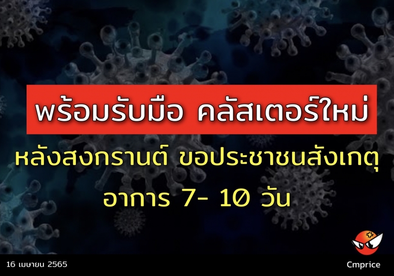 | • พร้อมรับมือ คลัสเตอร์ใหม่ หลังสงกรานต์ ขอประชาชนสังเกตุอาการ 7- 10 วัน |