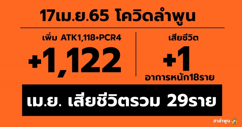 17เม.ย.65 โควิดลำพูน +1,122ราย เสียชีวิต1ราย อาการหนัก18ราย