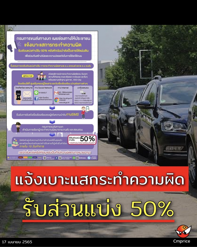 กรมการขนส่งทางบก เผย!!! ช่องทางรับแจ้งเบาะแสการกระทำความผิด ตามกฎหมายว่าด้วยรถยนต์ และกฎหมายว่าด้วยการขนส่งทางบก รับส่วนแบ่งค่าปรับ 50% หลังหักเงินนำส่งเป็นรายได้แผ่นดิน เพื่อร่วมกันสร้างวินัยและความปลอดภัยในการใช้รถใช้ถนน เริ่มวันที่ 9 ธันวาคม 2562 เป็นต้นไป
