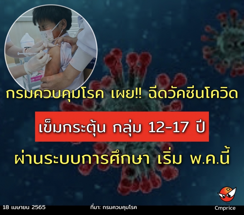 | • กรมควบคุมโรค เผย !!ฉีดวัคซีนโควิด เข็มกระตุ้น กลุ่ม 12-17 ปีผ่านระบบการศึกษา เริ่ม พ.ค.นี้ |