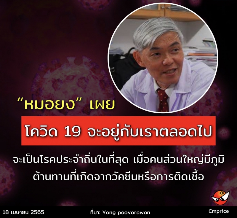 18 เม.ย.65 ศ.นพ.ยง ภู่วรวรรณ หัวหน้าศูนย์เชี่ยวชาญเฉพาะทางด้านไวรัสวิทยาคลินิก ภาควิชากุมารเวชศาสตร์คณะแพทยศาสตร์ จุฬาลงกรณ์มหาวิทยาลัย เปิดเผยผ่านเฟซบุ๊กส่วนตัว โดยระบุว่า