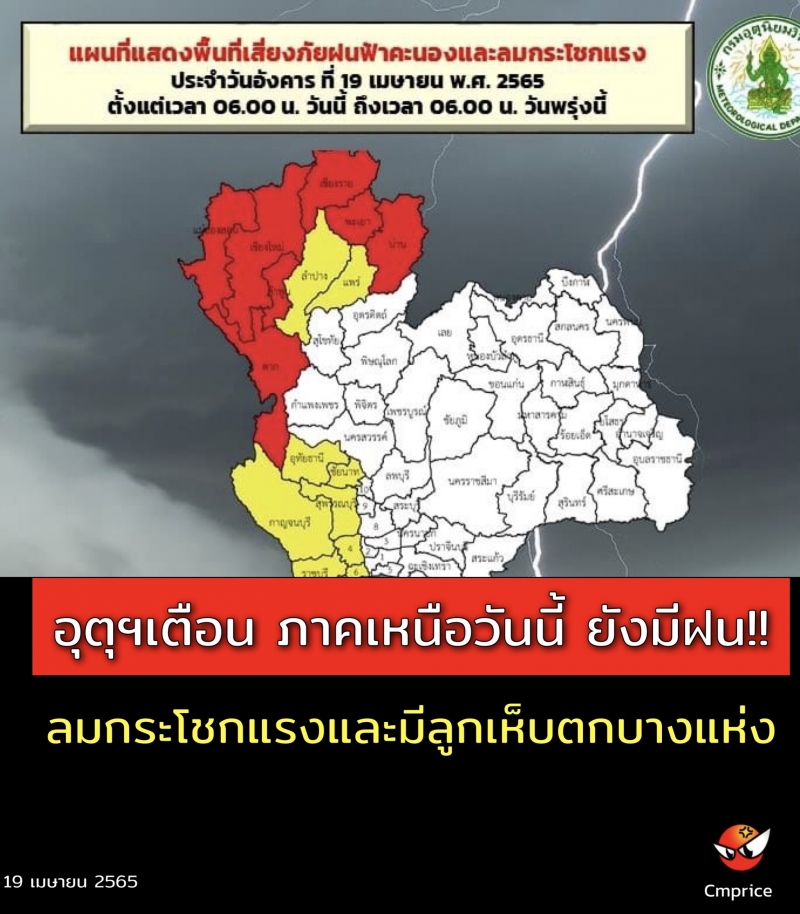 •ภาคเหนือ มีฝนฟ้าคะนองร้อยละ 60 ของพื้นที่ กับมีลมกระโชกแรงและมีลูกเห็บตกบางแห่ง