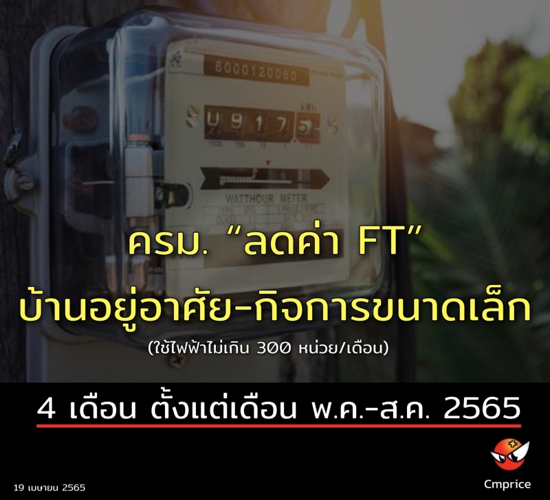 ปรับเป็นให้ส่วนลดอัตราค่าไฟฟ้าผันแปร (FT) แก่ผู้ใช้ไฟฟ้าประเภทบ้านอยู่อาศัยและประเภทกิจการขนาดเล็ก (ไม่รวมส่วนราชการและรัฐวิสาหกิจ) ที่มียอดการใช้ไฟฟ้าไม่เกิน 300 หน่วยต่อเดือน เป็นระยะเวลา 4 เดือน ตั้งแต่เดือนพ.ค.-ส.ค. 2565 ซึ่งจะทำให้มาตรการมีความชัดเจนและเป็นการช่วยเหลือแบบมุ่งเป้า