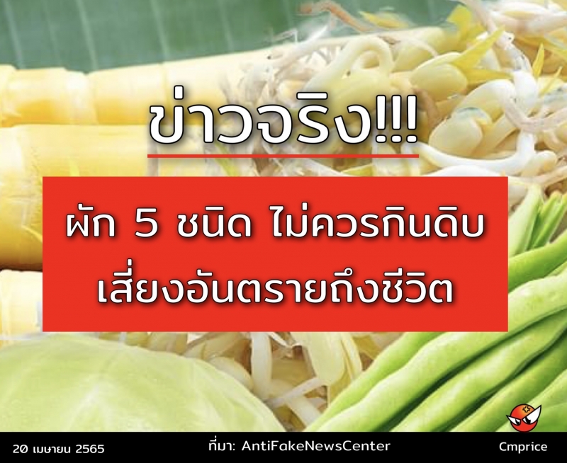 ตามที่มีการเผยแพร่ข้อมูลในสื่อสังคมออนไลน์เกี่ยวกับประเด็นเรื่องผัก 5 ชนิด ไม่ควรกินดิบ เสี่ยงอันตรายถึงชีวิตทางศูนย์ต่อต้านข่าวปลอมได้ดำเนินการตรวจสอบข้อเท็จจริงโดยสำนักโภชนาการ กรมอนามัย กระทรวงสาธารณสุขพบว่าประเด็นดังกล่าวนั้น เป็นข้อมูลจริง